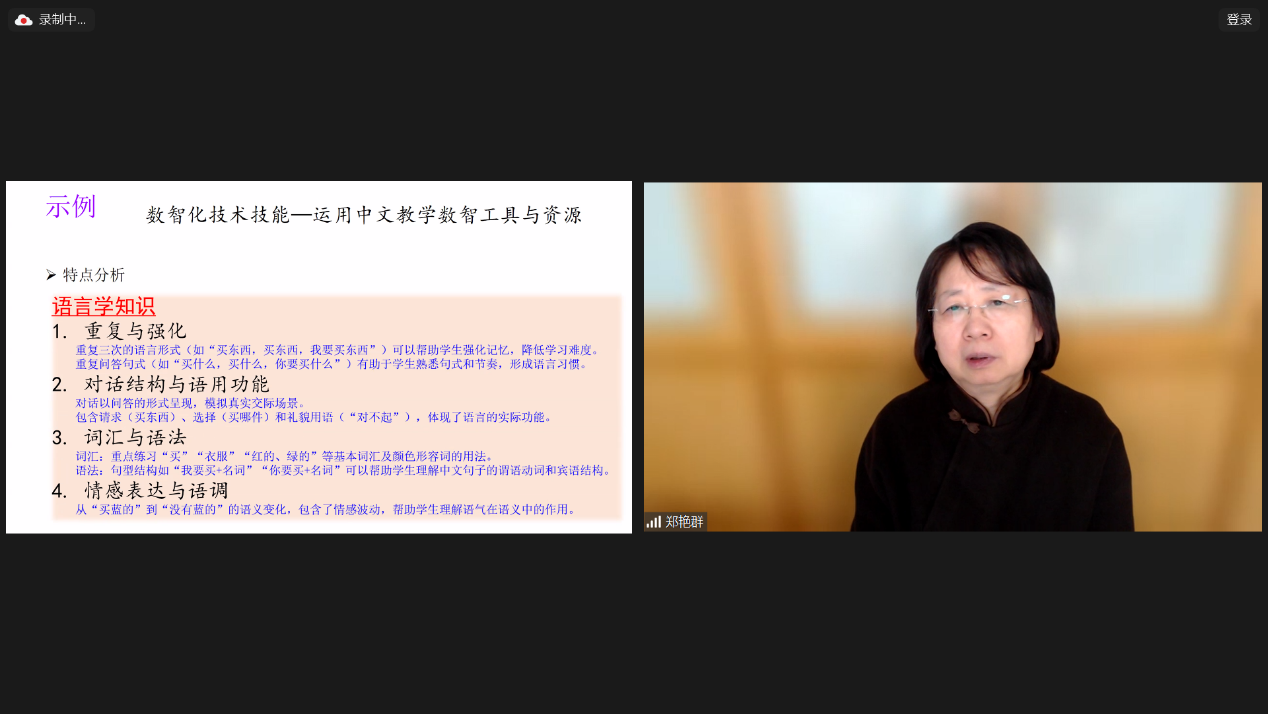 讲座中,郑教授系统地阐述了智能技术对国际中文教育领域的深远影响。她以教育数字化转型为切入点,分析了当前国际中文教育所面临的挑战,并强调了通过人工智能、大数据分析、虚拟现实等前沿技术推动教学模式革新的重要性。