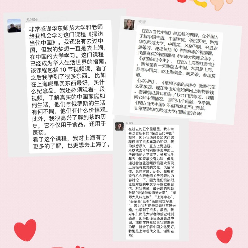 尤利娅(俄罗斯):非常感谢金沙js9线路中心主页和老师给我学习《探访当代中国》课程的机会。我还没有去过中国,但我的梦想一直是去上海,在中国的大学学习。这门课程里的10个视频让我学到了很多东西,比如在上海哪里买东西最好,买什么纪念品。我还了解了真实的中国家庭如何生活,他们与俄罗斯的生活有何不同,他们有什么价值观。此外,我很高兴了解到茶的历史,它不仅用于食品,还用于医药。现在我对上海有了更多的了解,也更想去上海了。
